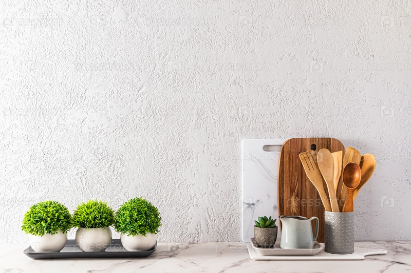 Современный кухонный фон с эко-посудой и растениями в керамических горшках на мраморной белой столешнице. копия пространства