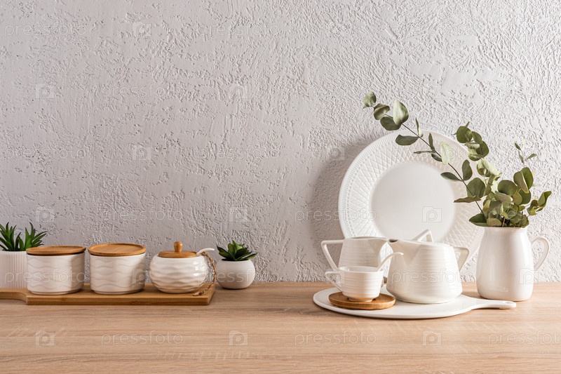 Белые керамические блюда и банки с деревянными крышками на столешнице. кухня фон. серая фактурная стена. место для текста