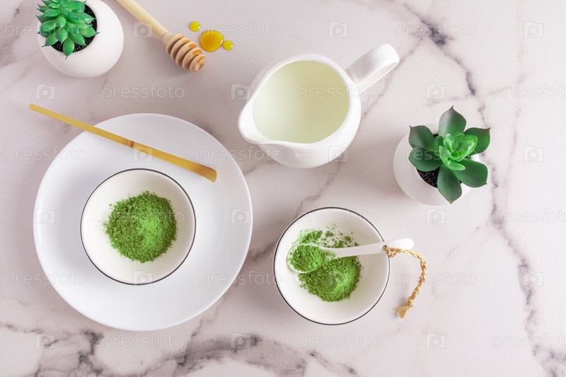 Порошок чая маття в белых керамических мисках и специальная мерная ложка из бамбука на мраморном столе. вид сверху. традиционный японский чай