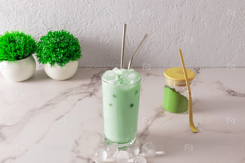 Зеленый чай маття далгон в высоком стакане с металлической соломинкой и круглыми кусочками льда. порошок зеленого чая в стеклянной банке. альтернатива холодному кофе