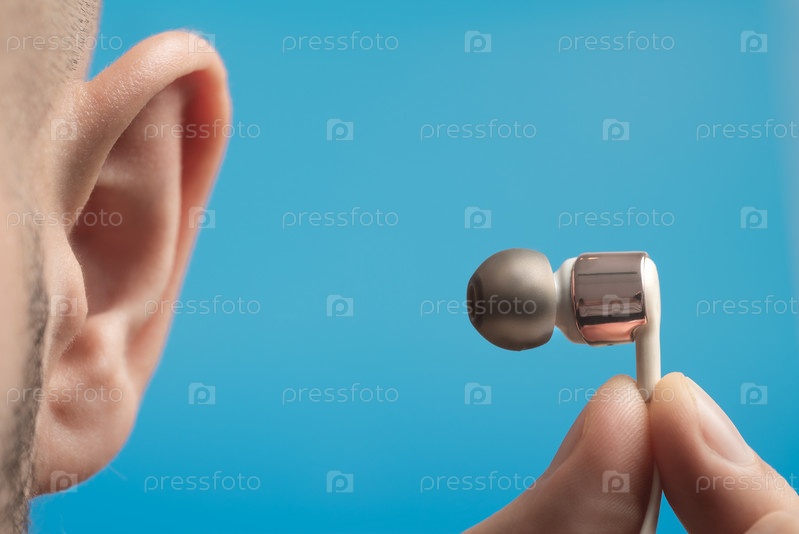 Небольшой наушник в мужской руке возле уха. Синий фон