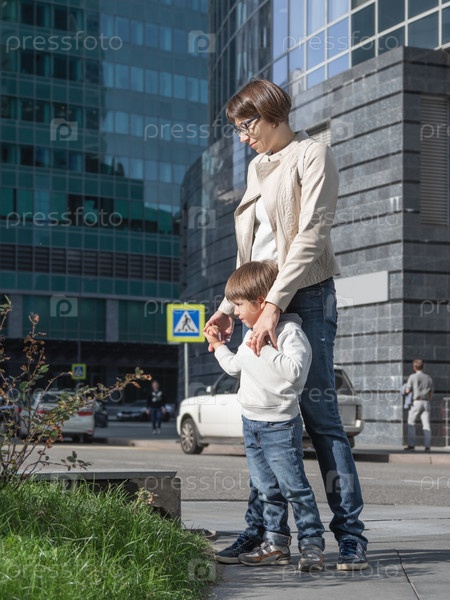 Мать и сын стоят на улице в солнечном свете. Женщина и ребенок в современном городе с транспортным движением и дорожным знаком. Семья в городе