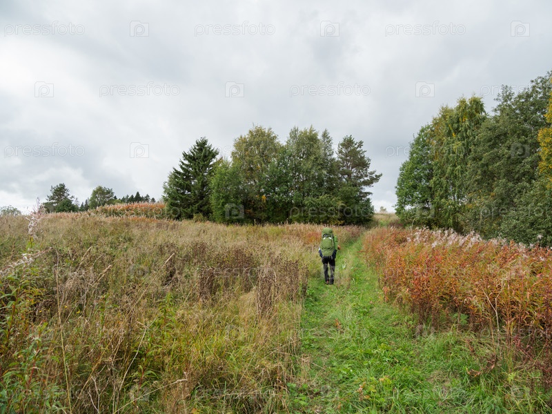 Турист идет по проселочной дороге. Человек с туристическим рюкзаком ходит в поход летом или осенью. Активный образ жизни. Активный отдых на свежем воздухе