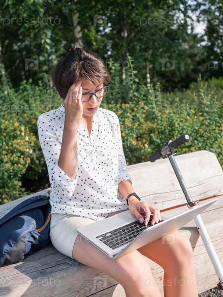 Озадаченная женщина работает с ноутбуком на деревянной скамейке в городском парке. Летние вибрации. Современное рабочее место для фрилансеров. Студент учится онлайн на открытом воздухе