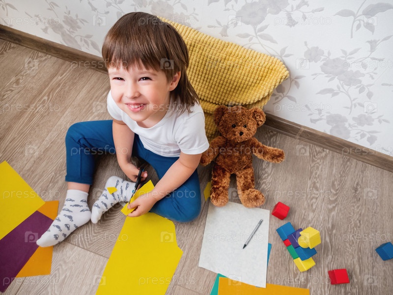 Малыш учится резать цветную бумагу ножницами. Малыш сидит на полу в детской комнате с игрушечными блоками и плюшевым мишкой. Образовательные занятия для детей. Развитие чувственных ощущений и мелкой моторики в домашних условиях