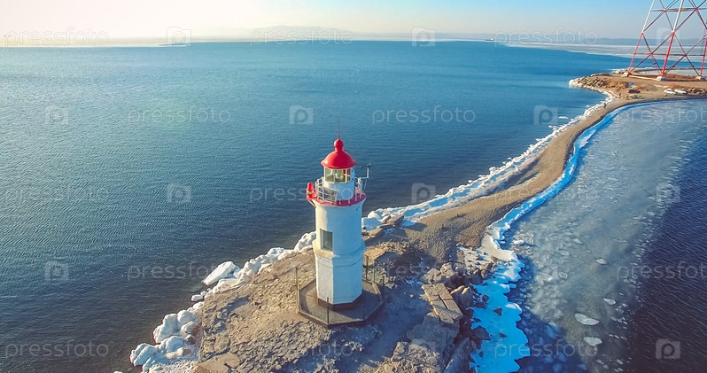 Аэрофотосъемка маяка Токарева на фоне синего моря