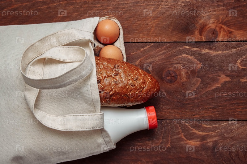 Холщовый белый мешок с едой, молочным хлебом и яйцами на коричневом деревянном фоне, вид сверху с пустым пространством для текста, экологически чистая концепция упаковки, покупки, фермерский магазин, приготовление завтрака и пожертвования