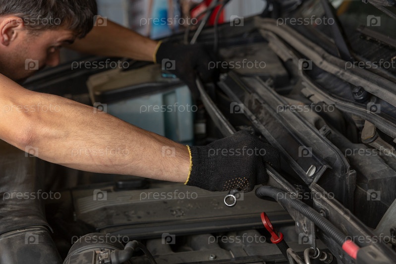 Автосервис, ремонт, техническое обслуживание и концепция людей - автомеханик ищет неисправность в двигателе автомобиля