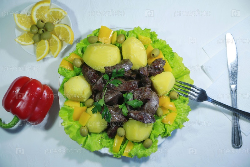 Печень жареная , потрошки с отварным картофелем и овощами