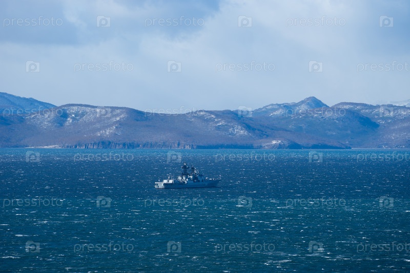 Морской пейзаж с военным кораблем в Авачинской бухте