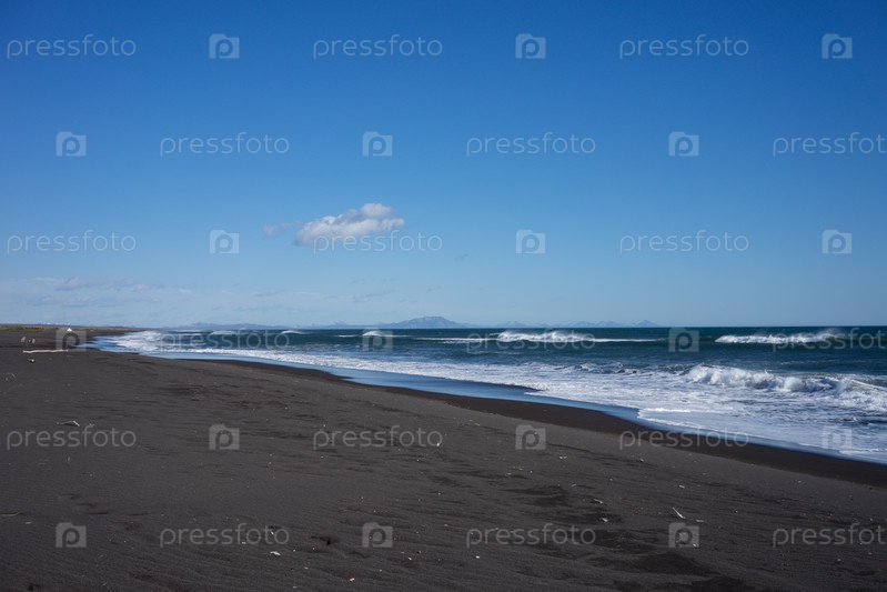 Морской пейзаж с вулканическим пляжем на полуострове Камчатка