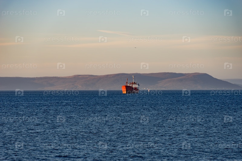 Морской пейзаж с красным кораблем на горизонте