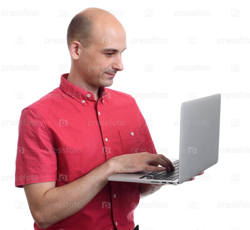 Человек с помощью ноутбука. Изолированные на белом фоне