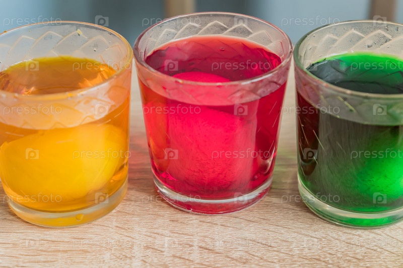Очки с яйцами в разноцветной красящей воде, крупный план