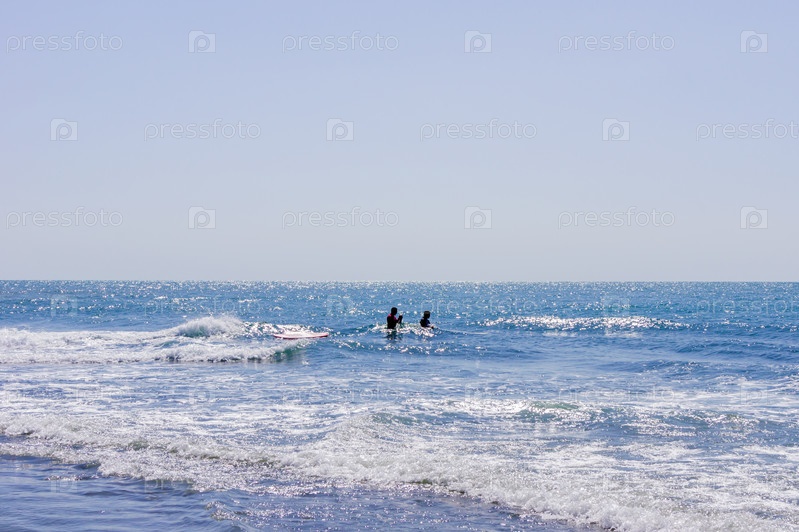 Двое мужчин плавают на доске для серфинга в море или океане в солнечный день. Концепция серфинга и отдыха