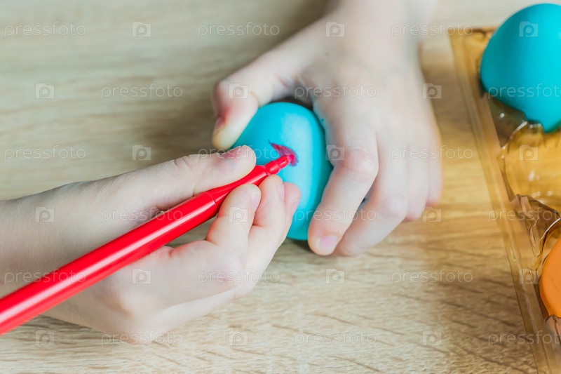 Детская ручная роспись пасхального яйца фломастером. Крупным планом
