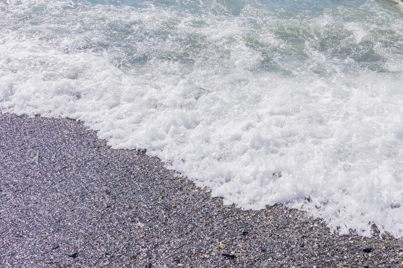 Галечная береговая линия. Морской берег с прозрачной водой и мелкими камнями