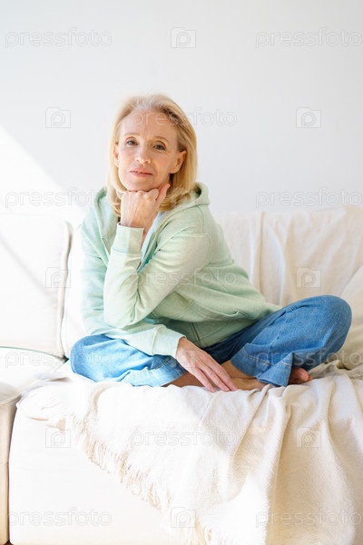 Улыбающаяся пожилая женщина смотрит в камеру и отдыхает на диване днем дома
