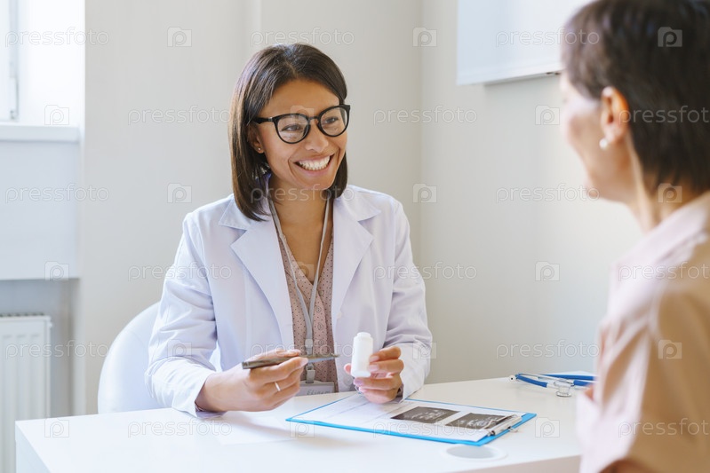 Улыбающаяся африканская женщина-врач прописывает лекарство клиенту в клинике