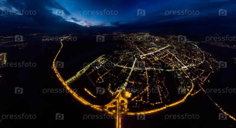 Калуга, Россия. Гагаринская развязка. Гагаринский мост. Ночной город. С высоты птичьего полета