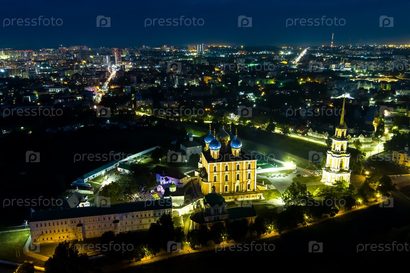 Рязань, Россия. Рязанский Кремль. Огни города. Время после захода солнца. С высоты птичьего полета