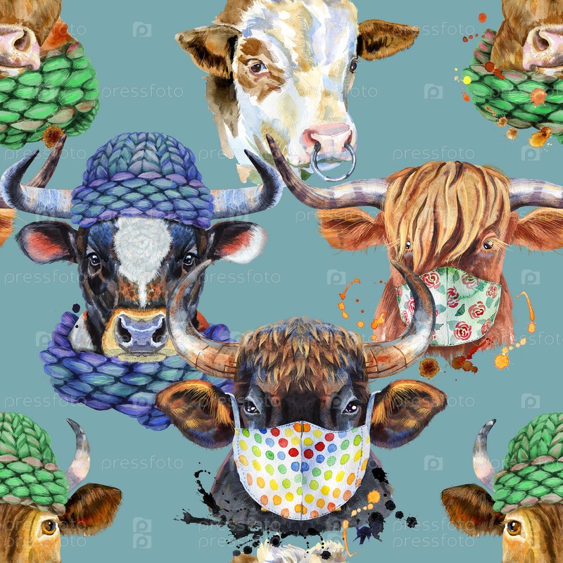 Акварельная графика быка. Бесшовный узор. Иллюстрация животного быка с всплеском акварельного текстурированного фона
