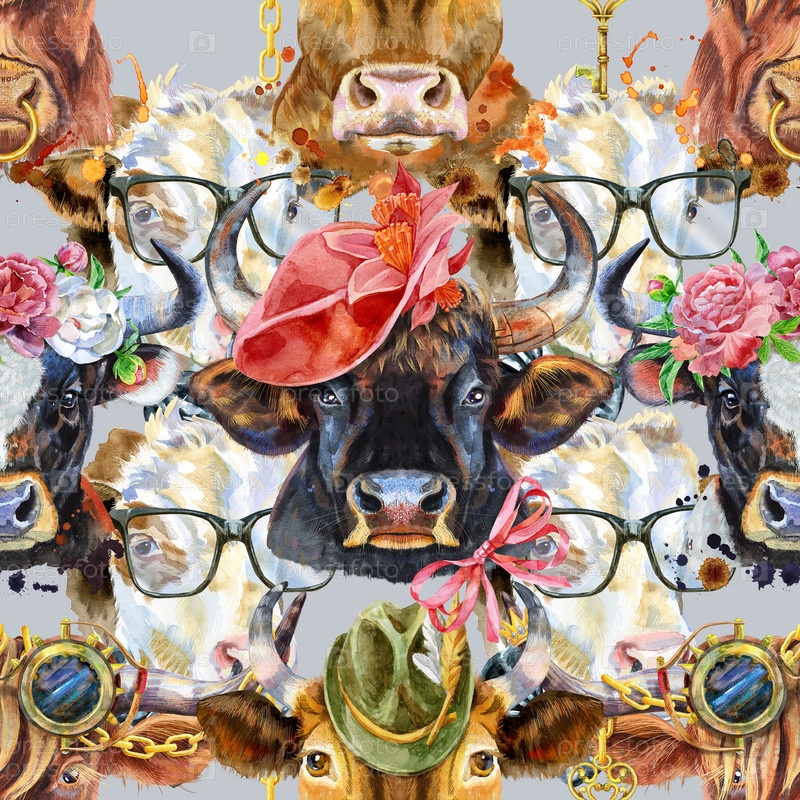 Акварельная графика быка. Бесшовный узор. Иллюстрация животного быка с всплеском акварельного текстурированного фона