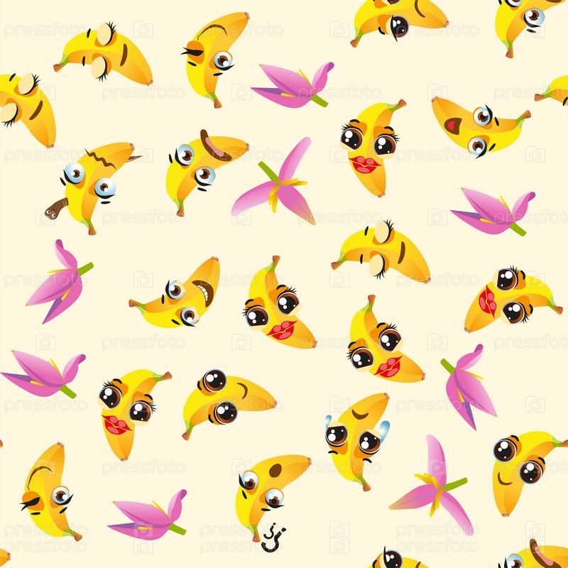 Бесшовный узор из экзотических фруктов банан. Смешные милые лица персонажей