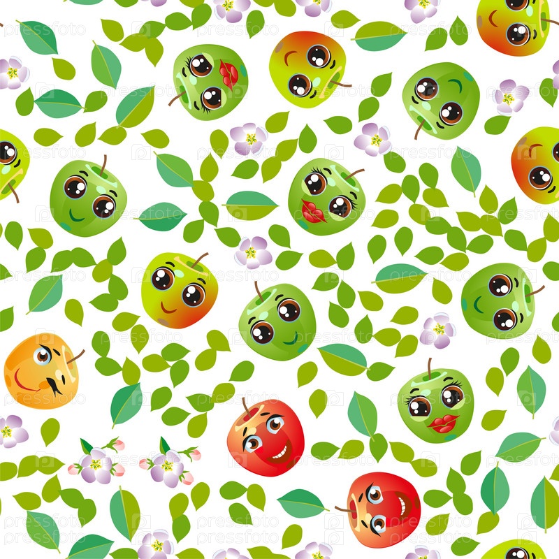 Бесшовный рисунок фруктового яблока. Смешные милые лица персонажей