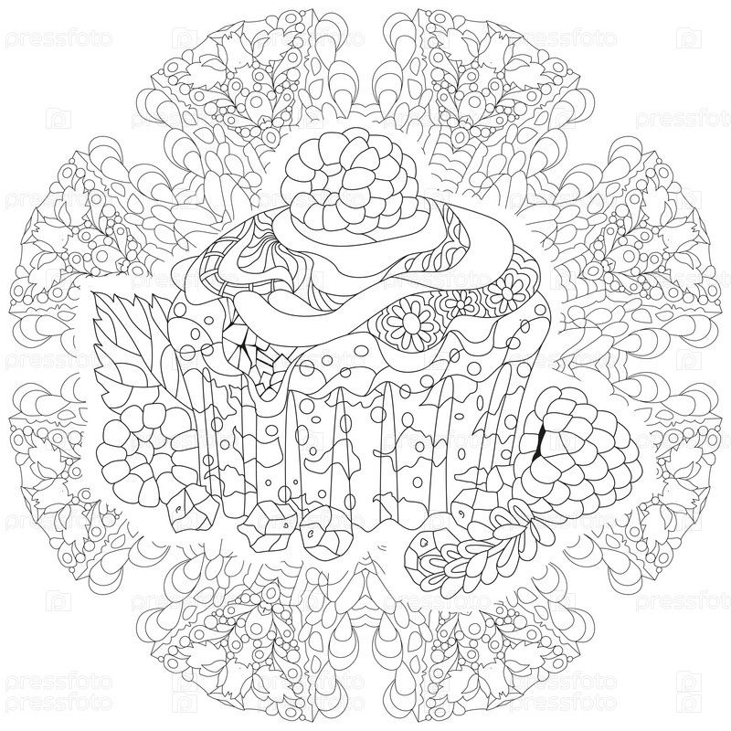 Векторный кусок торта на обрабатываемой круглой подложке.Ручной рисунок для окрашивания взрослых в стиле зентенгл, каракули.Окраски