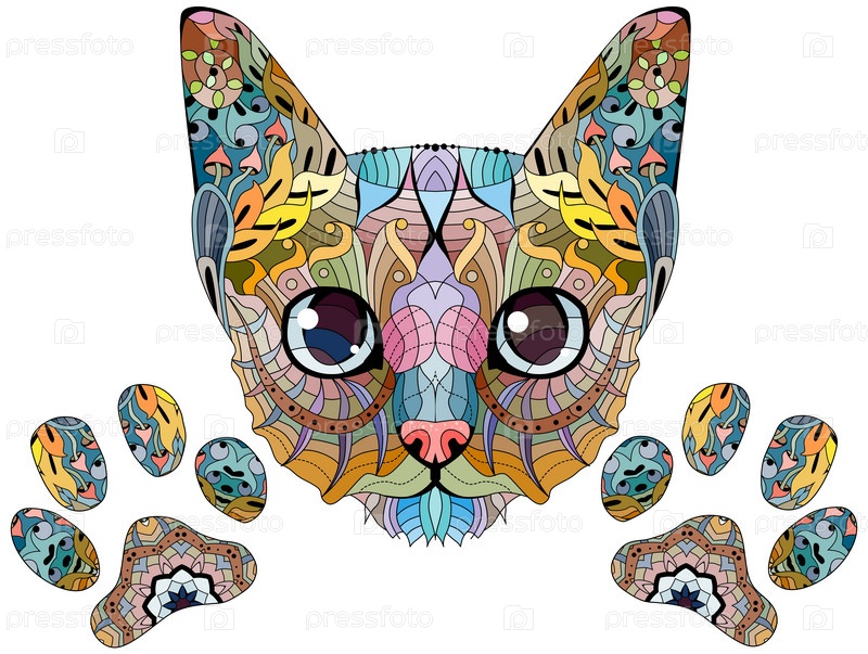 Голова кошки с зигзагообразной лапой в стиле футболки, татуировки и других украшений