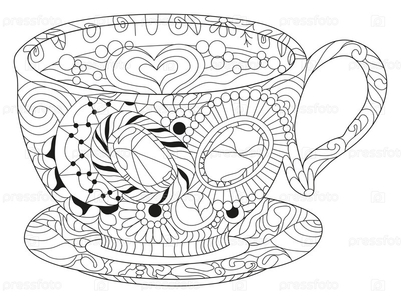 Векторная чашка кофе или чая с абстрактными орнаментами.Ручной рисунок для окрашивания для взрослых в стиле зентенгл, каракули.Окраски