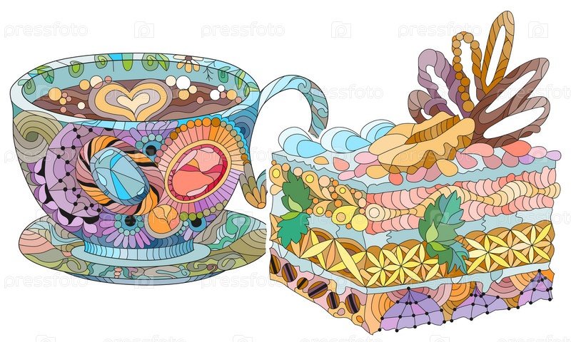 Вектор чашка кофе или чая с тортом и абстрактными орнаментами. Ручная иллюстрация для украшения футболки