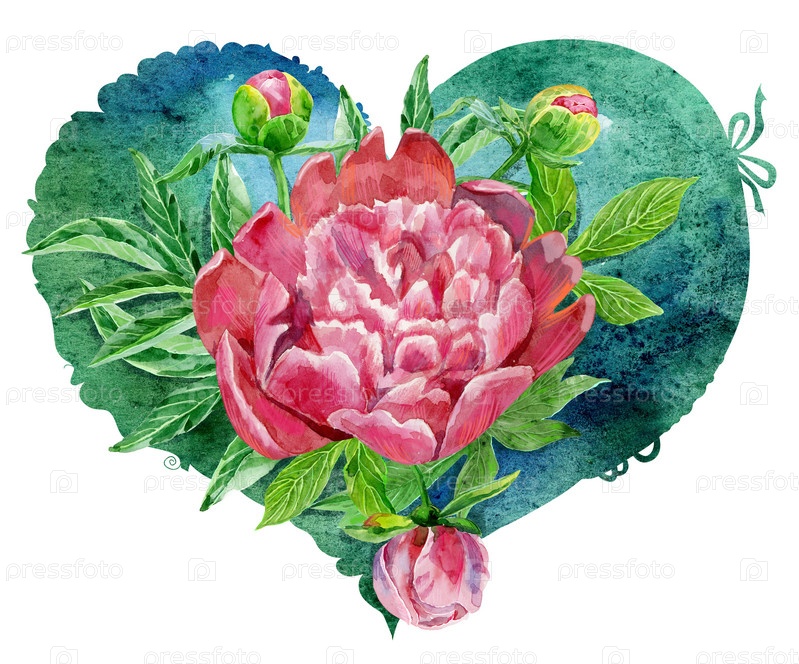 Акварельное зеленое сердце с розовыми пионами, расписанное вручную
