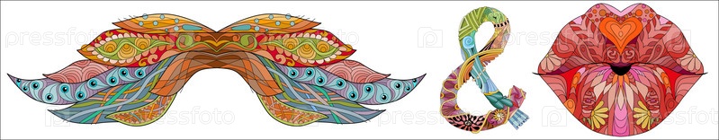 Усы и губы в стиле зентагле с четкими линиями для дизайна футболок, татуировок и других украшений