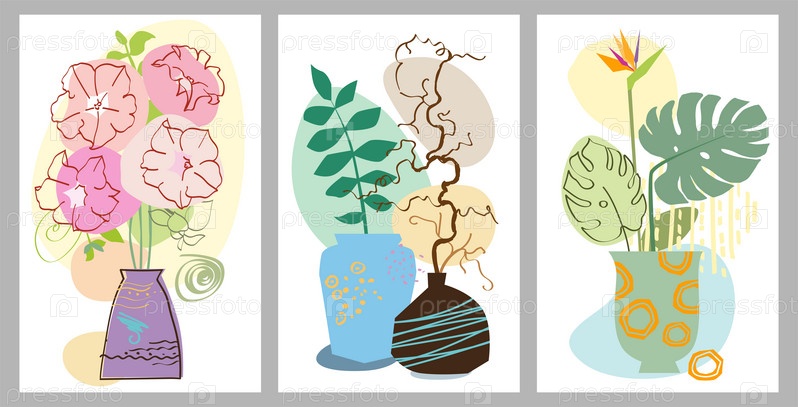 Набор абстрактных плакатов с вазами. Модный коллаж натюрморта с горшком, фруктами, вазой и тропическим пальмовым листом