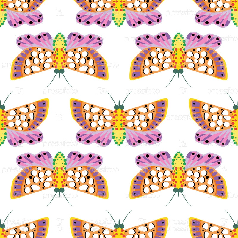 Бесшовный узор с бабочкой на белом фоне. Векторная иллюстрация. Печать на ткани, бумаге, обоях, дизайн упаковки