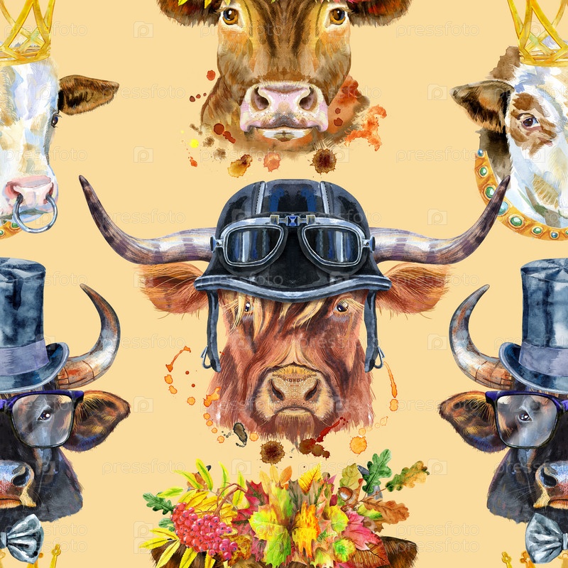 Акварельная графика быка. Бесшовный узор. Иллюстрация животного быка с всплеском акварельного текстурированного фона