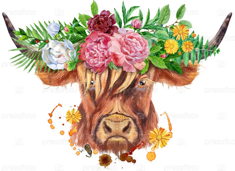 Акварельная иллюстрация коричневого рогатого быка с цветами