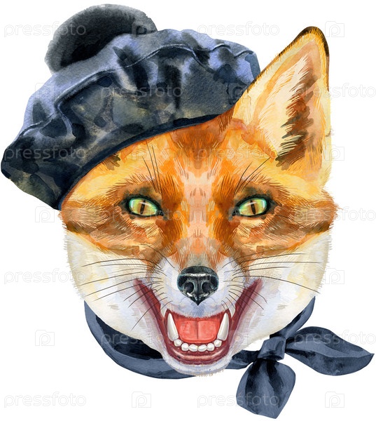 Голова лисы в черном берете с помпоном. Иллюстрация акварельной лисы на белом фоне