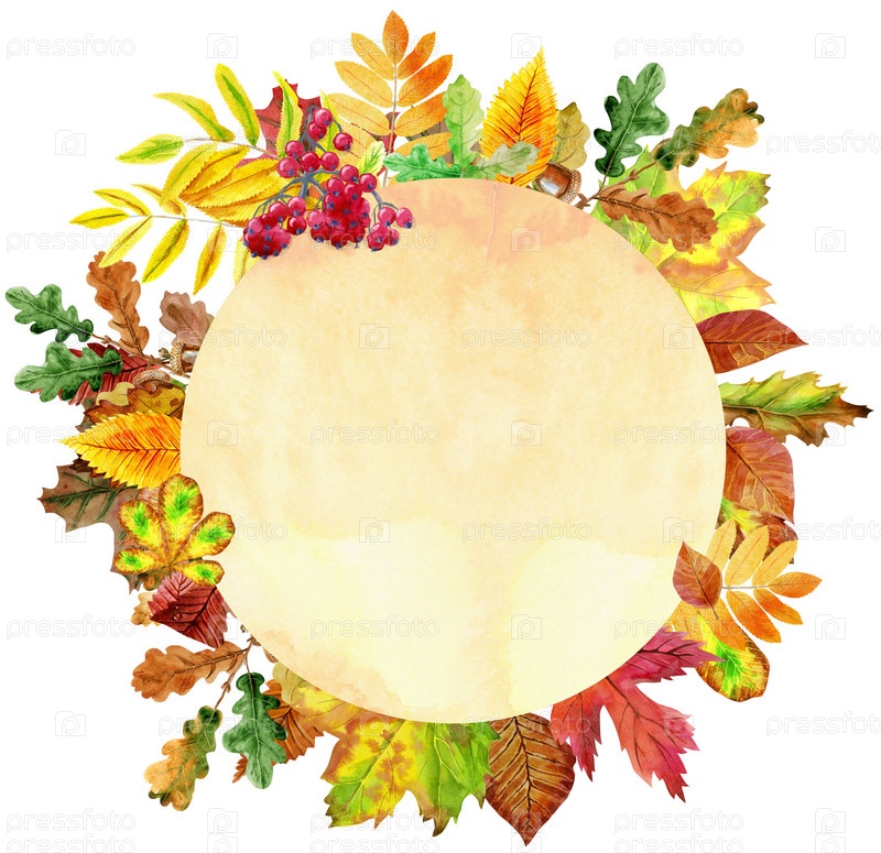 Бежевый круглый баннер с красными, оранжевыми, коричневыми и желтыми падающими осенними листьями