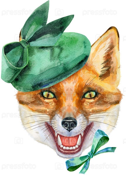 Голова лисы в зеленой шляпе. Иллюстрация акварельной лисы на белом фоне