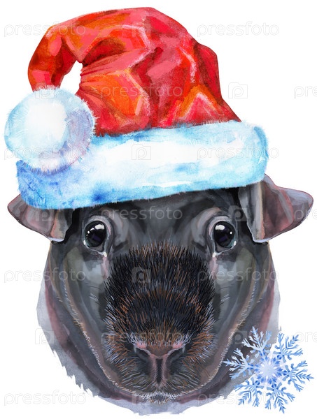 Акварельный портрет тощей морской свинки в шляпе Санты на белом фоне