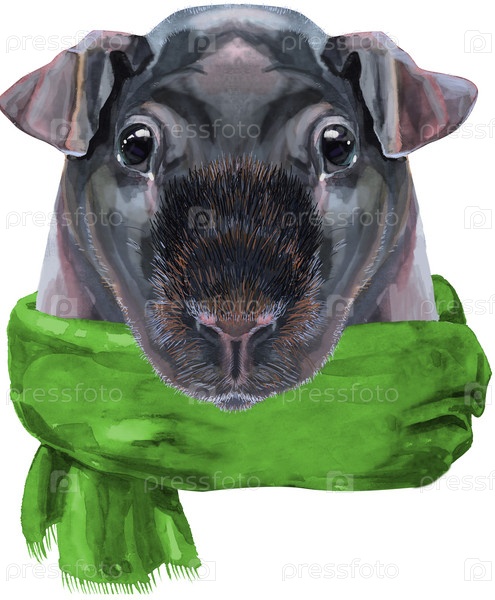 Милая морская свинка в зеленом шарфе. Свинья для графики на футболках. Акварельная иллюстрация тощей морской свинки