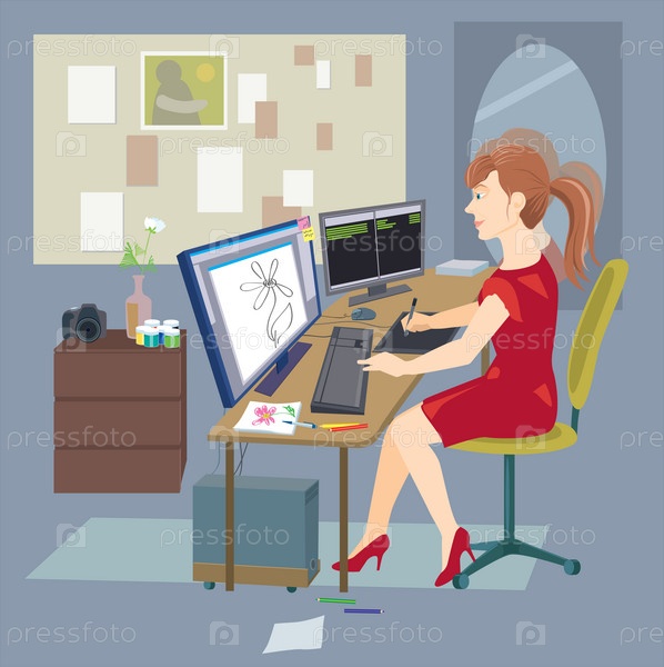 Девушка-дизайнер сидит за компьютером и рисует на графическом планшете