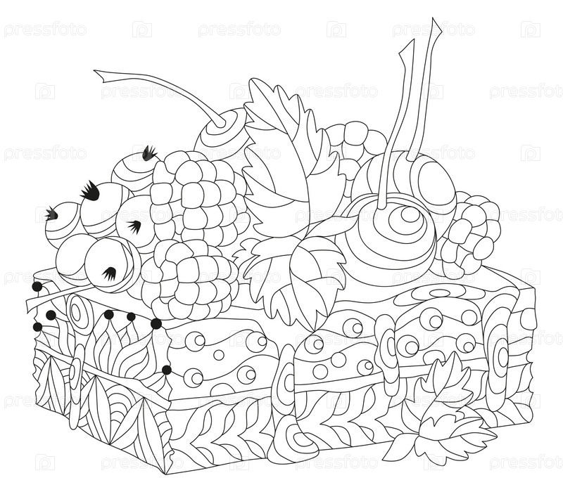 Векторный кусок пирога с абстрактными орнаментами.Ручной рисунок для окрашивания для взрослых в стиле зентенгл, каракули.Окраски