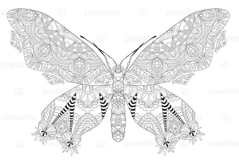 Бабочка в стиле zentangle с чистыми линиями для окраски для антистресса, дизайна футболки, татуировки и других украшений