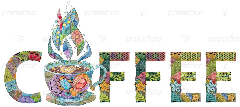 Художественный дизайн ручной росписи.Ручное изображение слов COFFEE с силуэтом чашки для футболок и других украшений