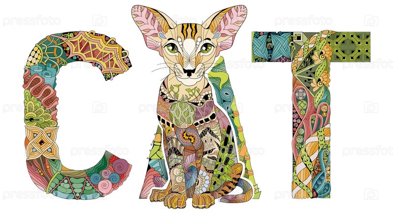 Слово CAT с рисунком кота. векторный декоративный объект zentangle