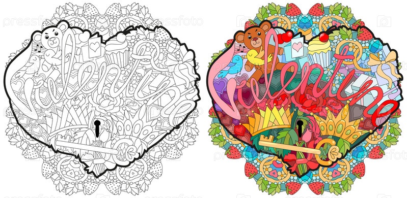 Эскизная иллюстрация сердца Doodle со словом VALENTINE с мандалой. набор цветов и контуров
